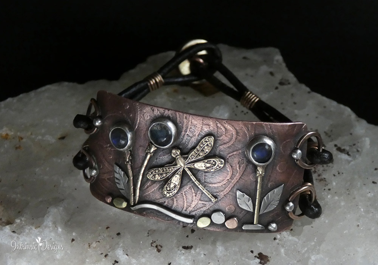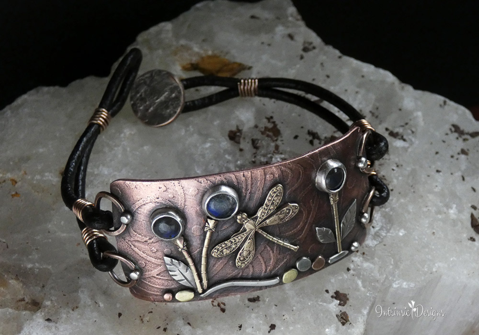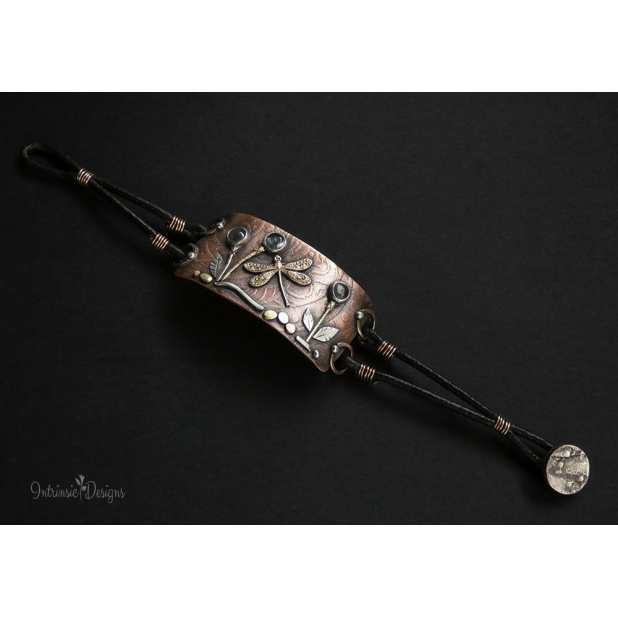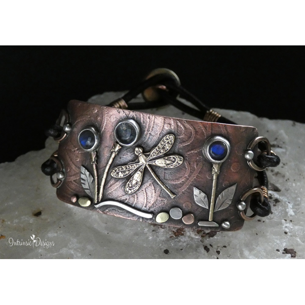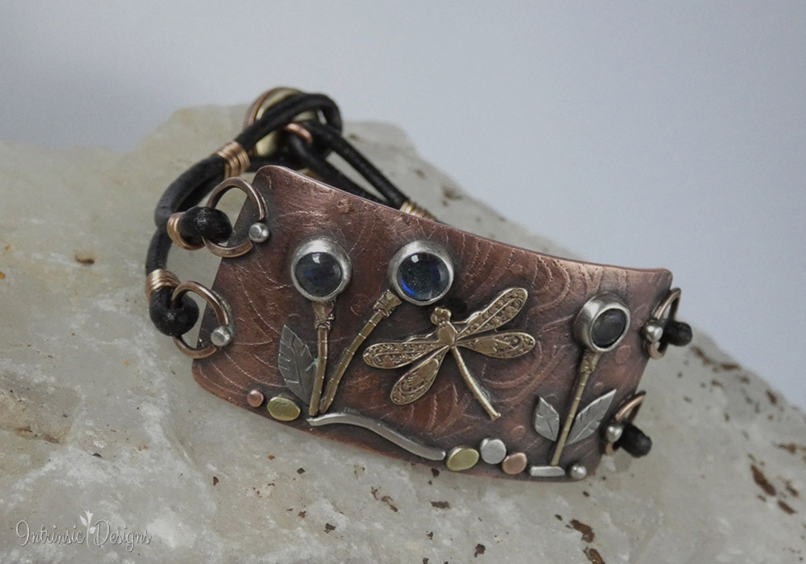 3 LITTLE LABRADORITE FLOWERS AND A DRAGONFLY ... LEATHER BRACELET WITH MIXED METALS