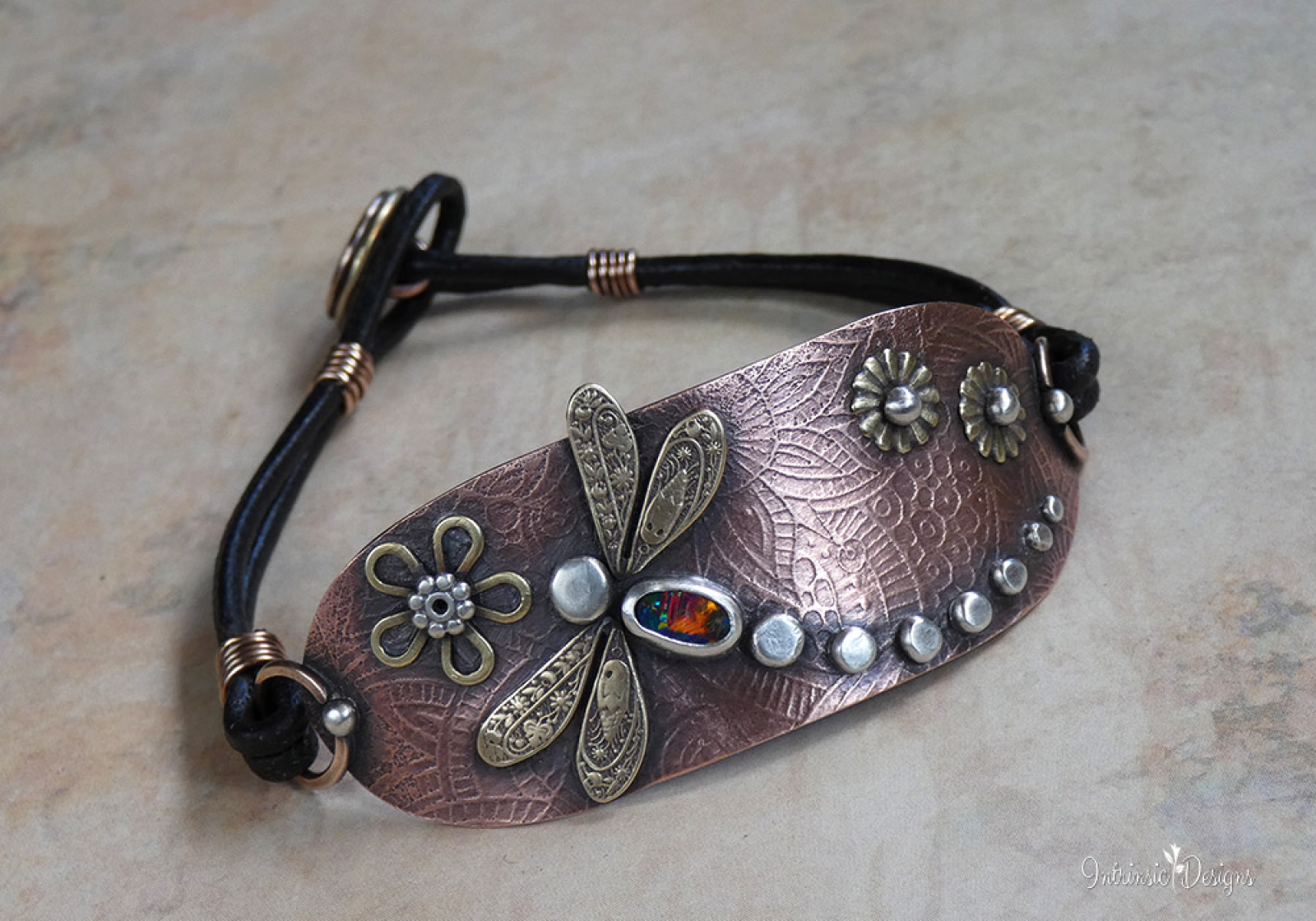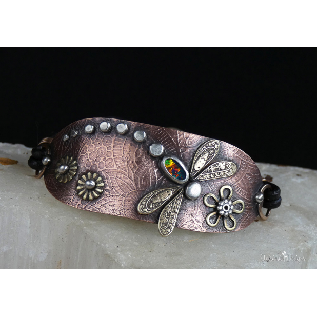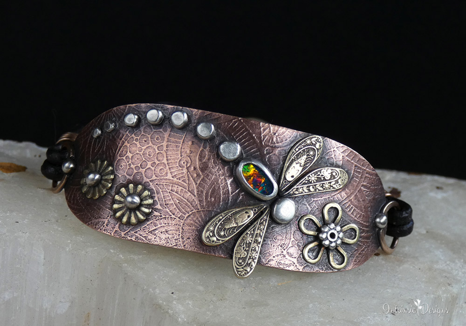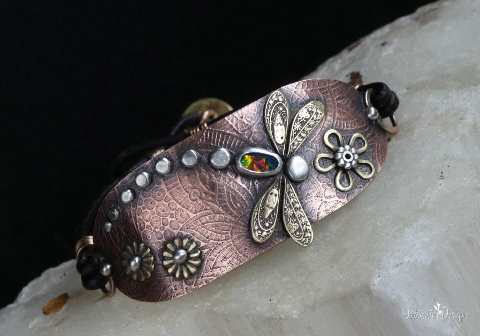 AUSTRALIAN BLACK OPAL DRAGONFLY LEATHER BRACELET WITH ETCHED COPPER, STERLING SILVER, BRONZE AND BRASS