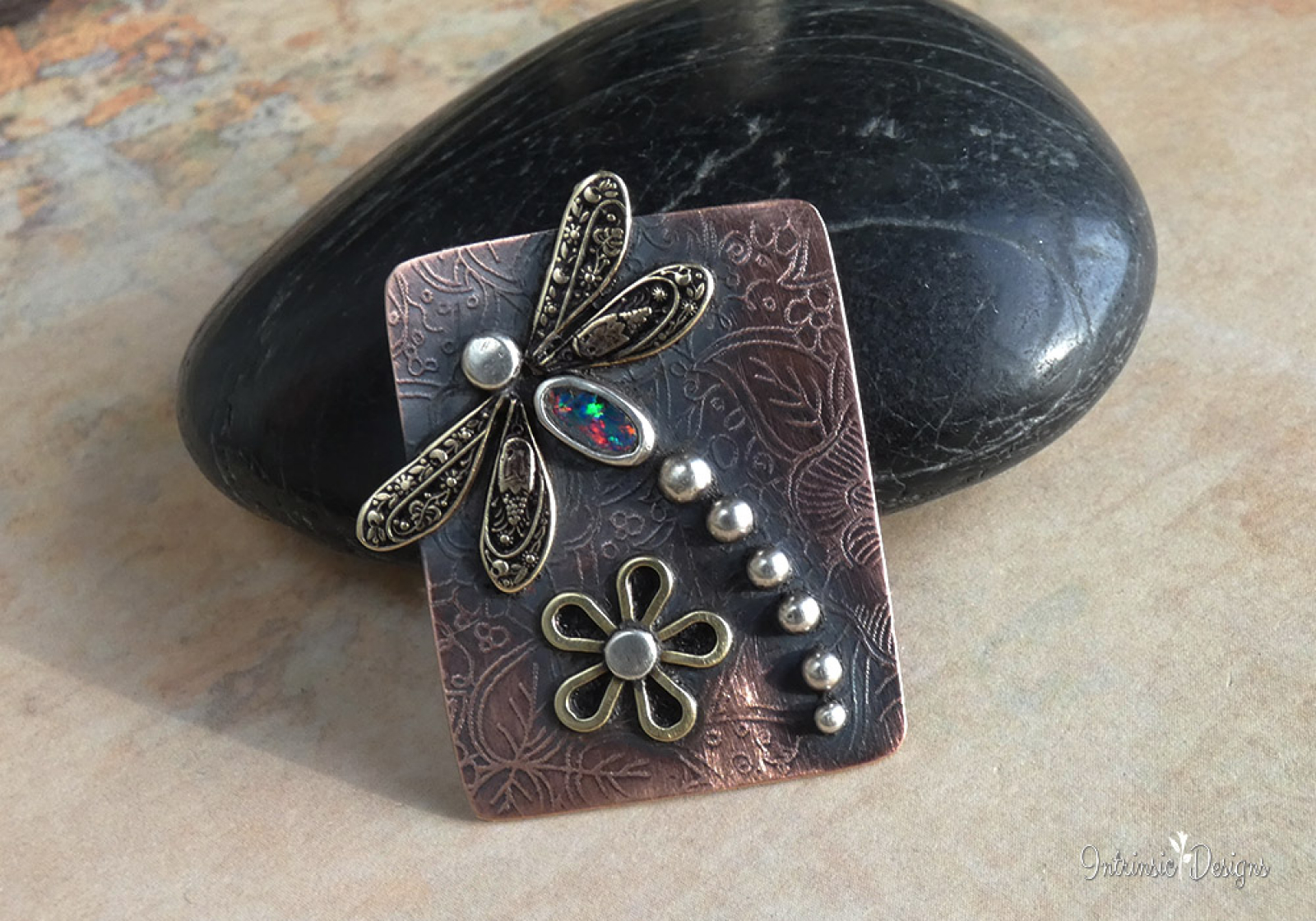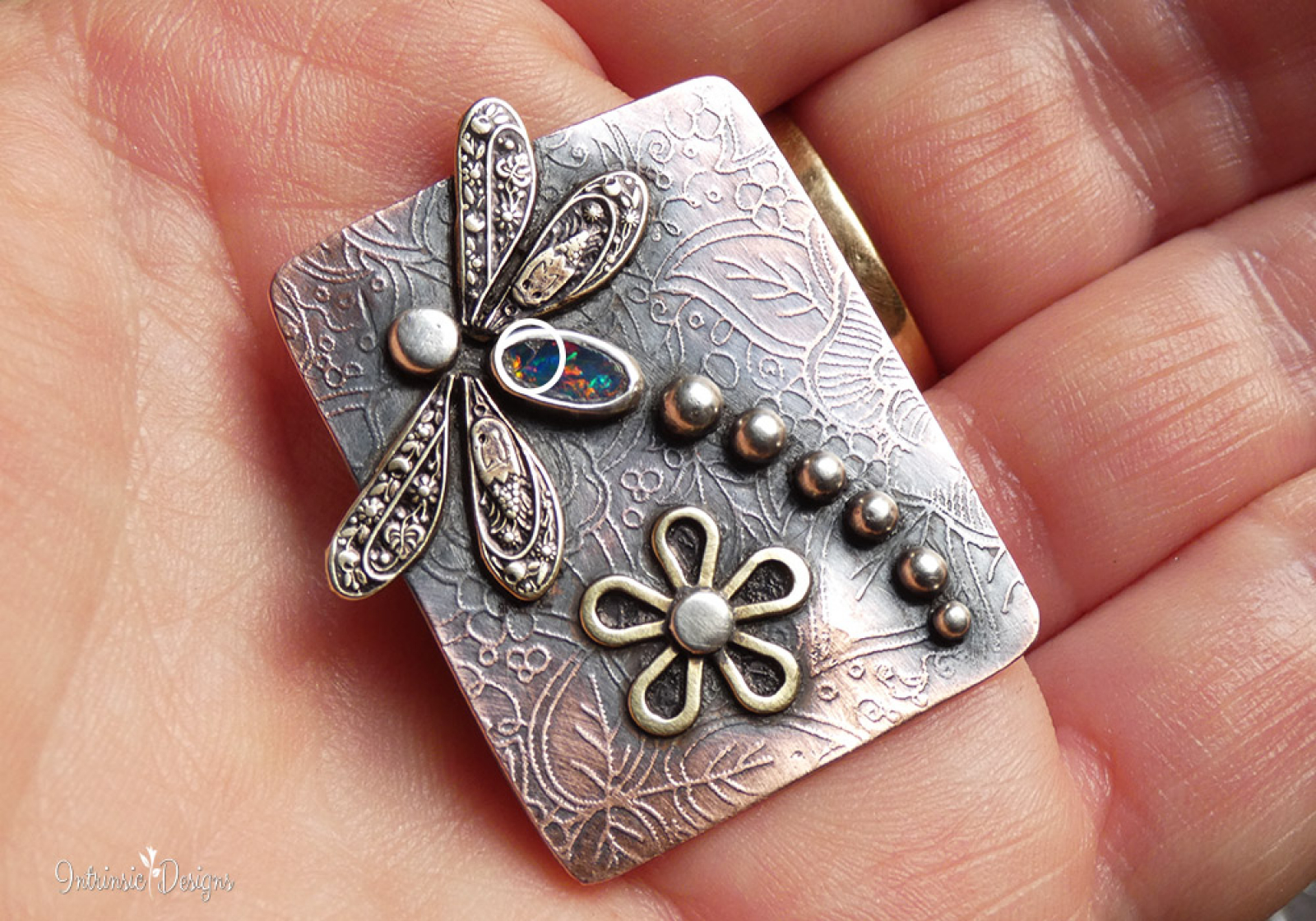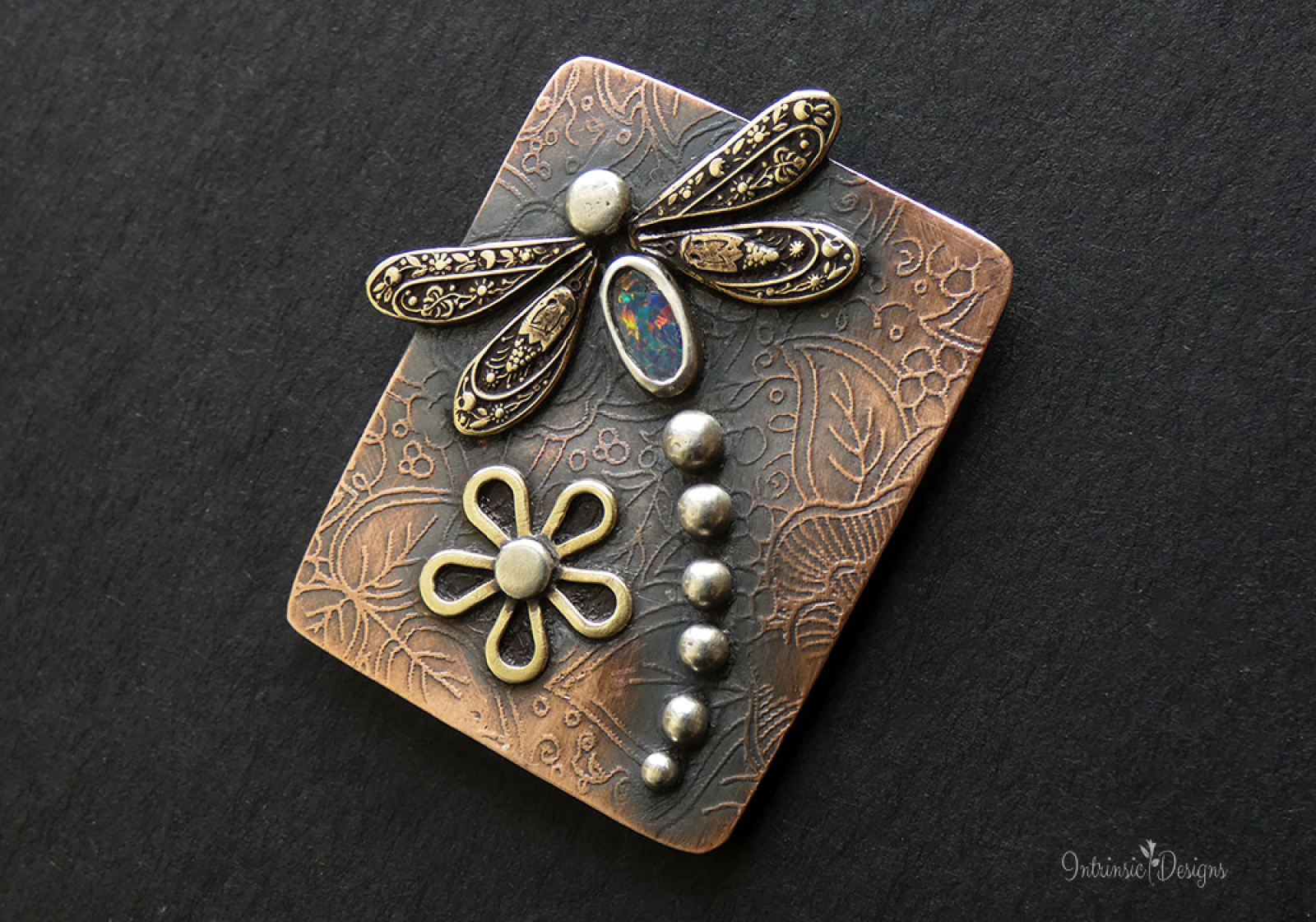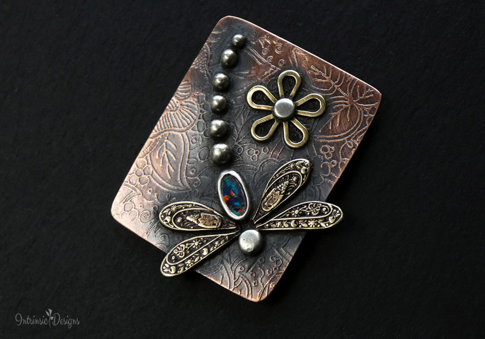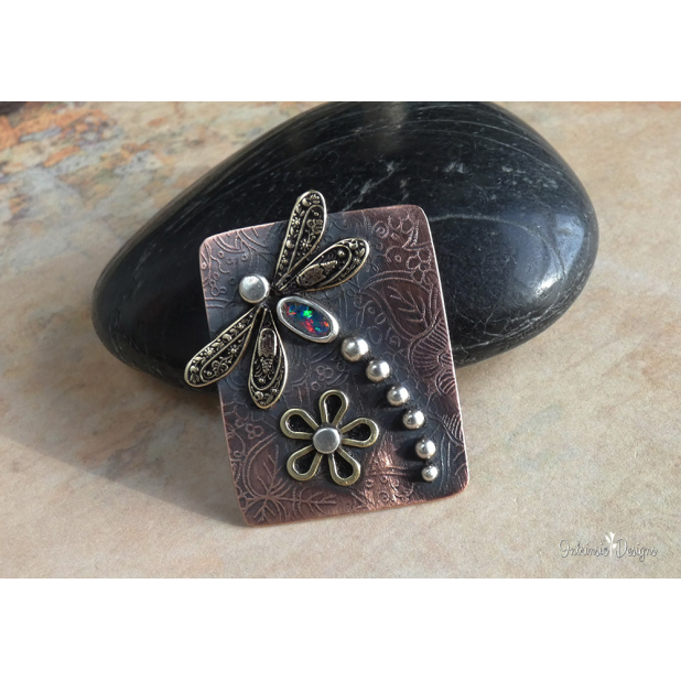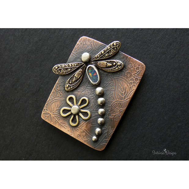 Featuring a spectacular Austalian Black Opal for the dragonfly body, bezel set in Fine Silver with Brass stamped wings and Sterling Silver head and tail.