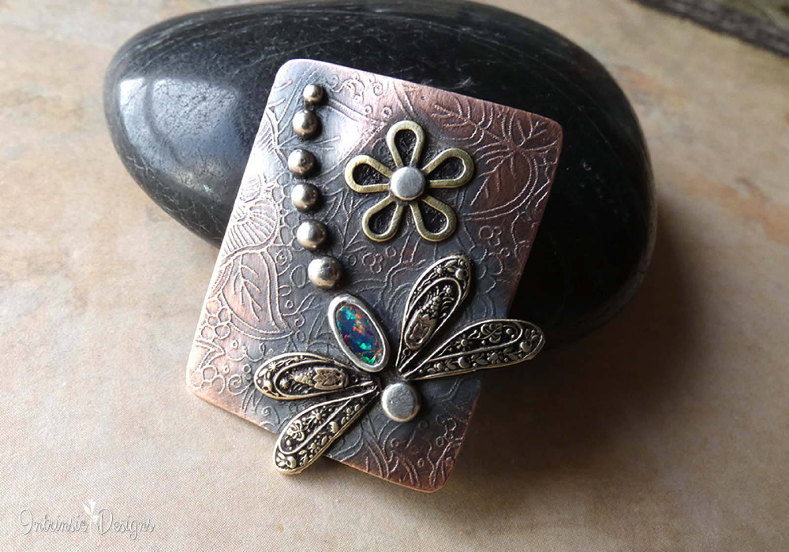 Backed with etched Copper and a little brass flower to finish it off.
