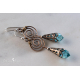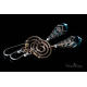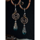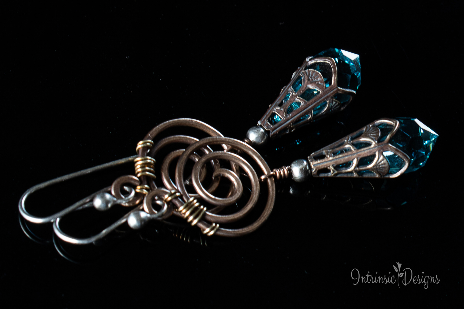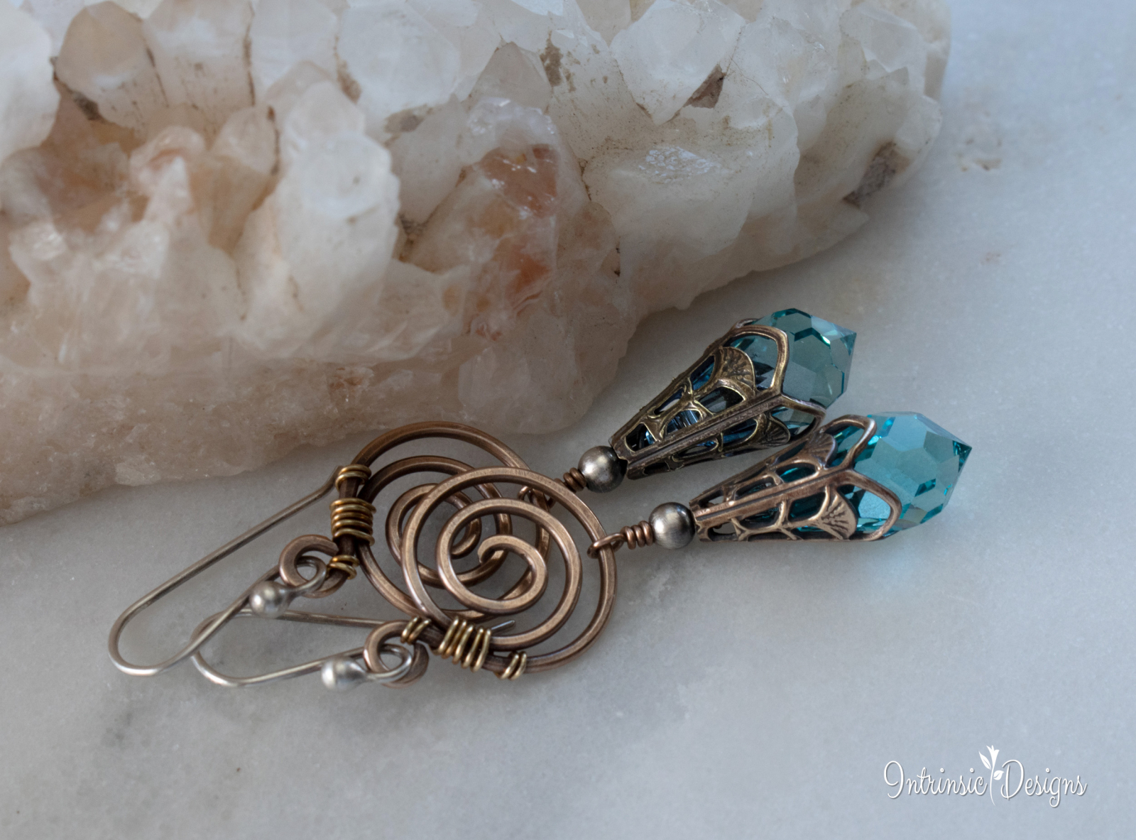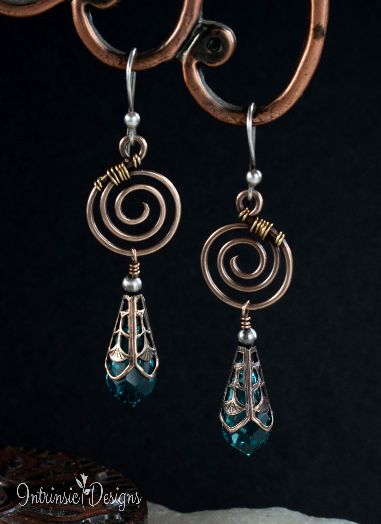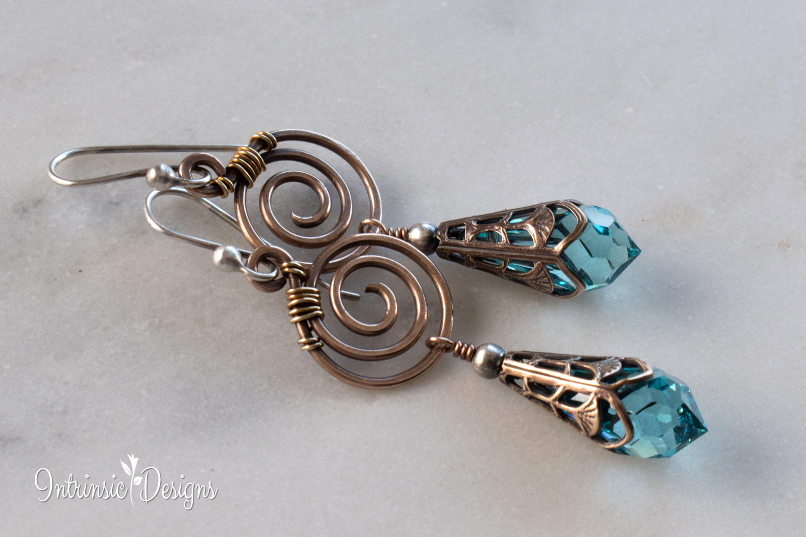 Dangling from a Bronze spiral are Turquoise Swarovski Crystal drops, capped in Art Nouveau Brass filigree.
