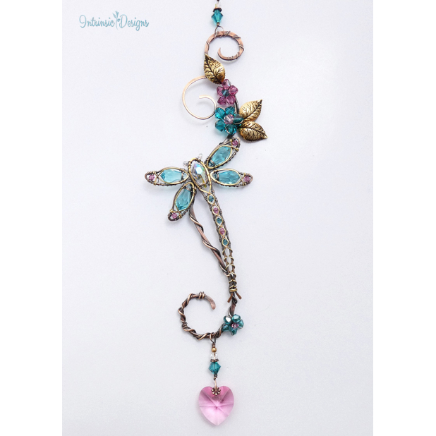 TURQUOISE & PINK DRAGONFLY SWAROVSKI CRYSTAL WINDOW SUNCATCHER IN MIXED METALS