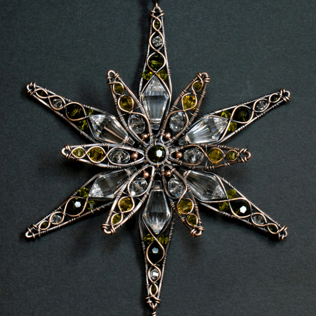 Dangling at the bottom is a Swarovski Spectra Pendulum, capped in Copper tone filigree.