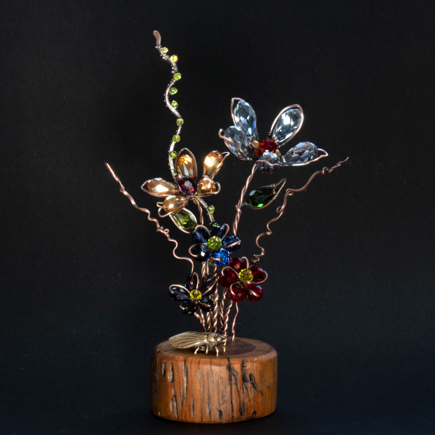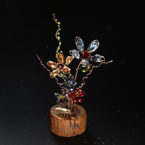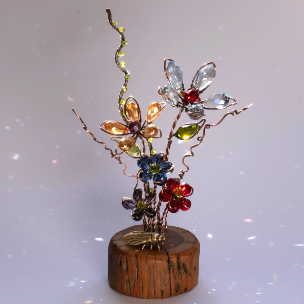 FLOWERS & A CICADA ON A WOOD SLICE ... WINDOWSILL SUNCATCHER .... IKEBANA STYLE