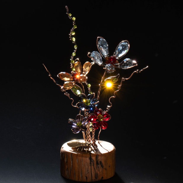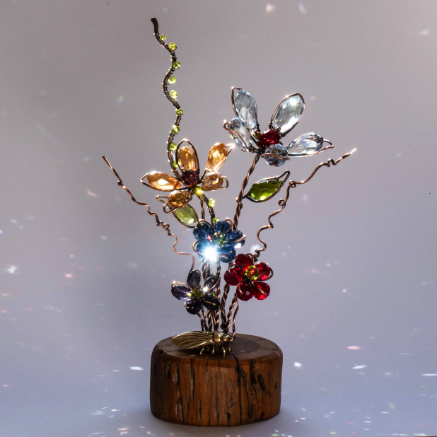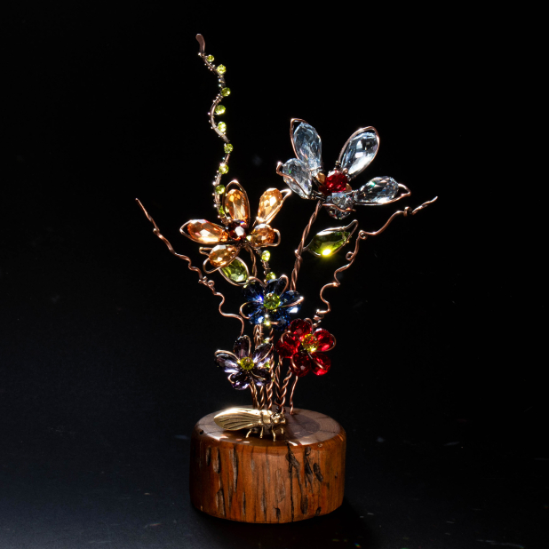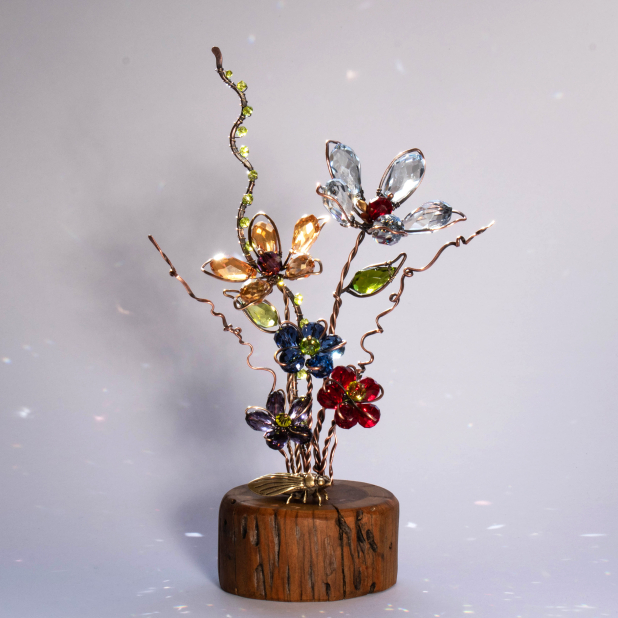 Behind the flowers is a Copper branch with little leaf buds of Light Olive Crystals.