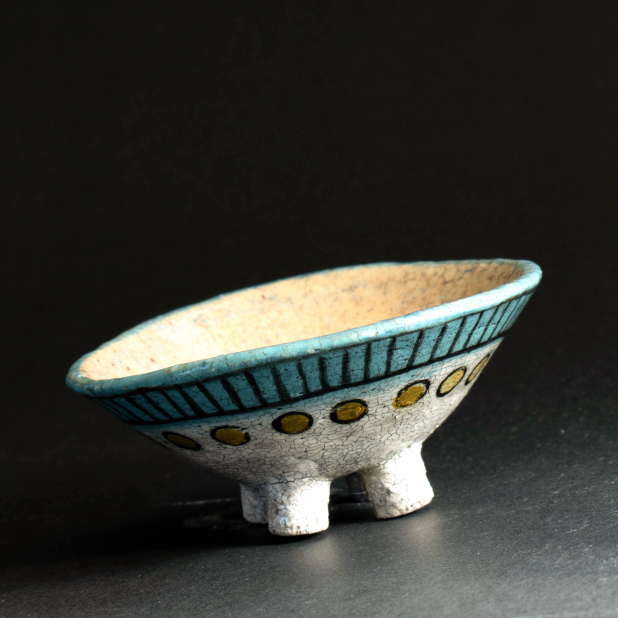 A FUN CERAMIC RING DISH WITH PAINTED DOTS AND STRIPES
