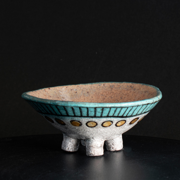 For the design, I painted a band of Turquoise with Black Stripes and some Green Tea dots with black outline in an underglaze on a White background with a crackle effect.