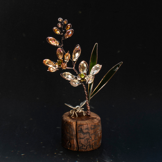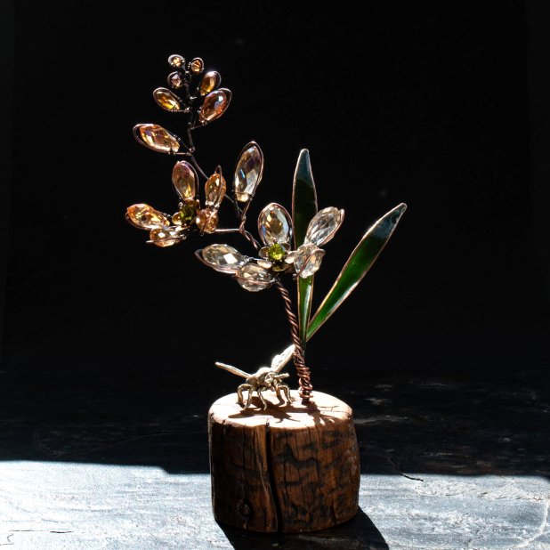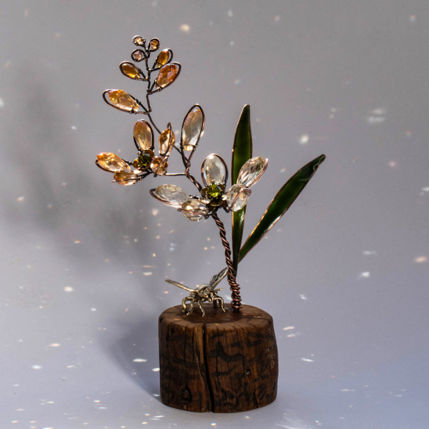 GOLDEN LILIES WITH A BRASS BEE ON A WOOD SLICE ... WINDOWSILL SUNCATCHER .... IKEBANA STYLE