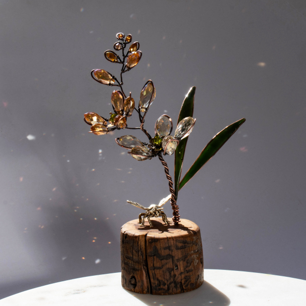 The Brass Bee sits on a Cypress Pine wood slice that is sealed with a Beeswax & Citrus polish.