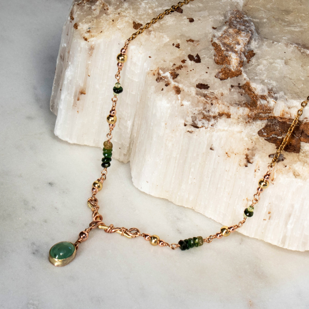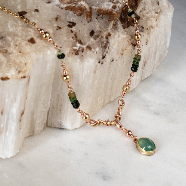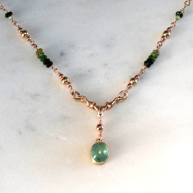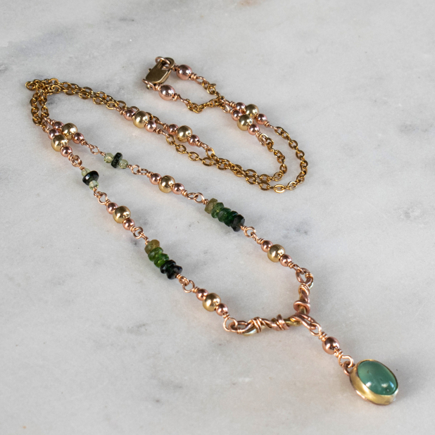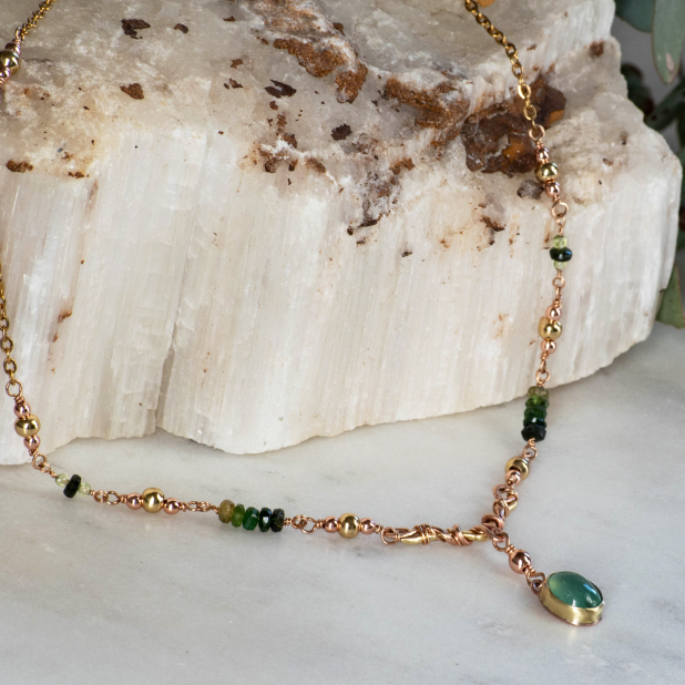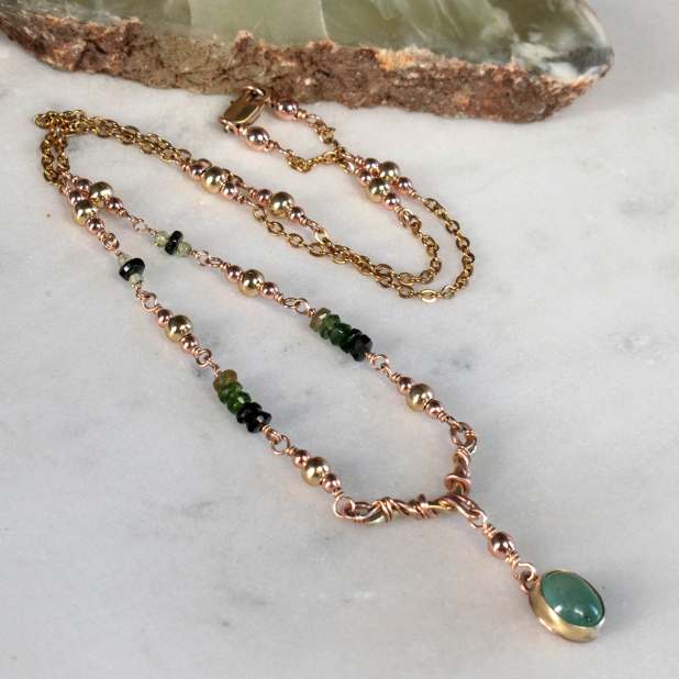 The handmade chain has varying shades of Tourmaline micro faceted beads, teeny tiny Peridots, 14K Gold & Rose Gold filled beads with a Gold filled quality chain and finished with a Brass Lobster Clasp.