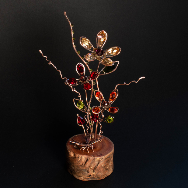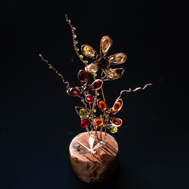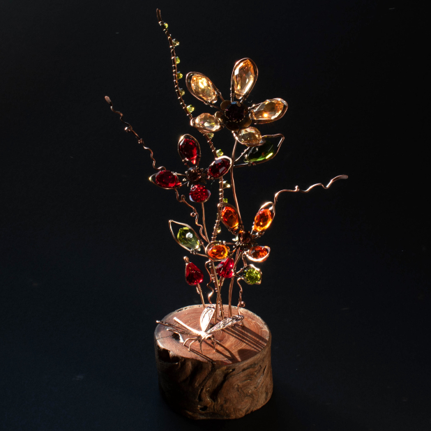 In the foreground are two Red Crystal flower buds on a Bronze stem two curly stems in Copper to evoke the Japanese Ikebana floral arrangements. .