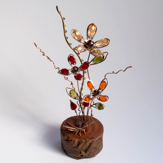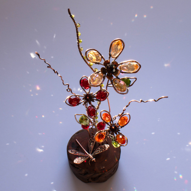 RESERVED FOR SHEILA .... FLOWERS & A DRAGONFLY ON A WOOD SLICE ... WINDOWSILL SUNCATCHER .... IKEBANA STYLE