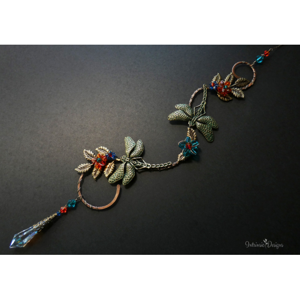 The dragonflies are a Vintaj patina'd brass on a Copper branch with brass leaves and flowers of Swarovski Crystal in Dark Turquoise, Burnt Orange and Ocean Blue.