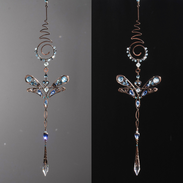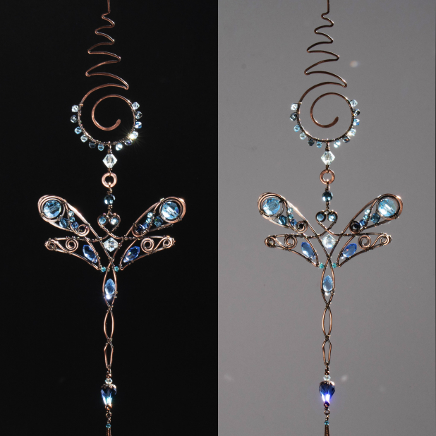 Featuring a wire wrapped Dragonfly, framed in Copper with Bronze spiral accents and wire wrapped in Bronze, with a variety of Blue Swarovski, Preciosa and Austrian Crystals.
