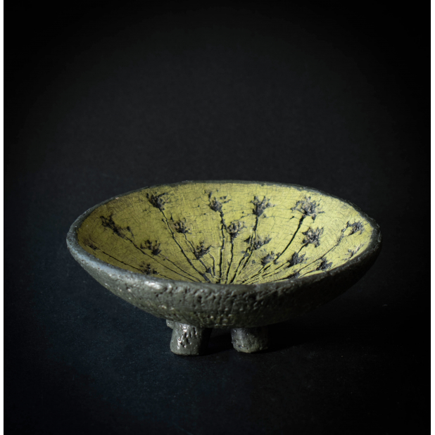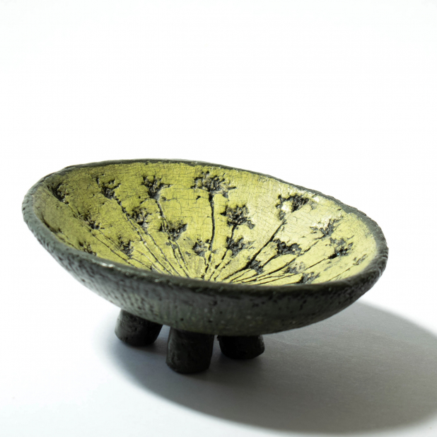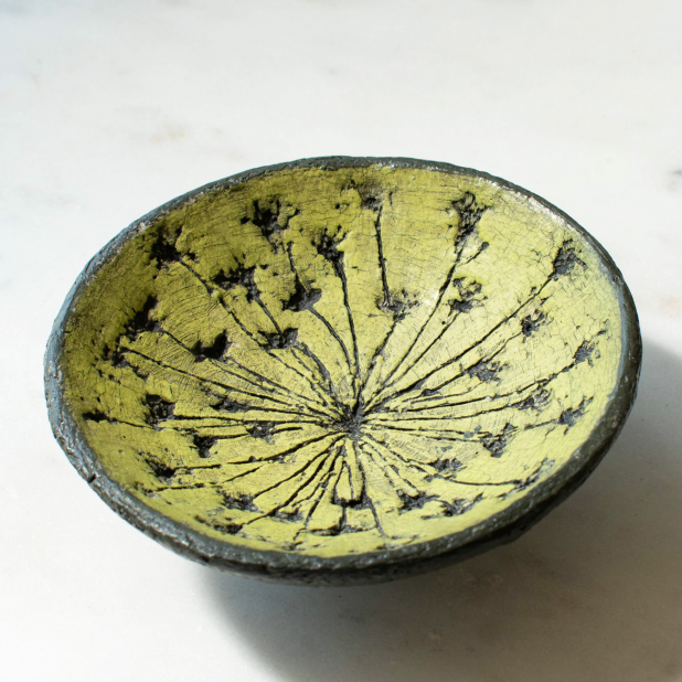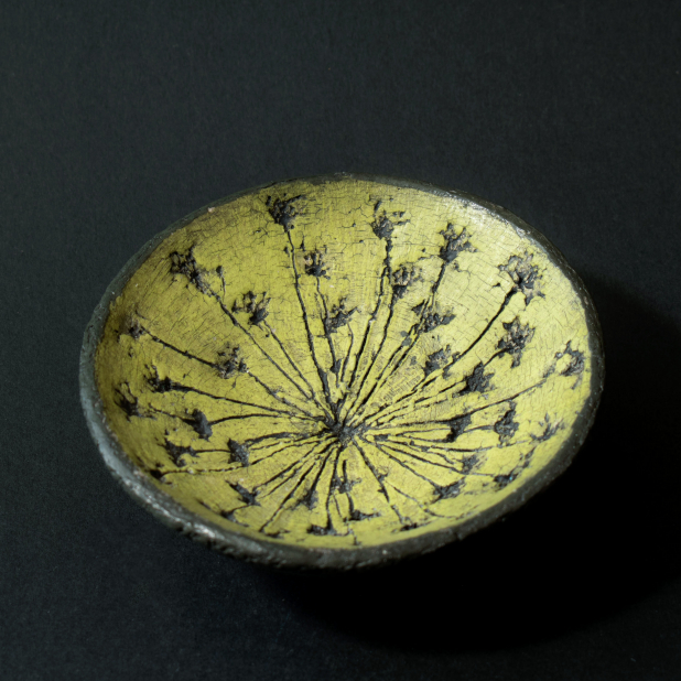 For the design, I pressed a large Meadow Parsley flower growing wild here on my property into Raku Clay. I then carefully pulled it out to reveal a beautiful radial impression of the flower.