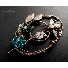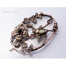 BEE OVAL SHAWL PIN / SWEATER PIN WITH SWAROVSKI FLOWERS, BRASS LEAVES AND MIXED METALS