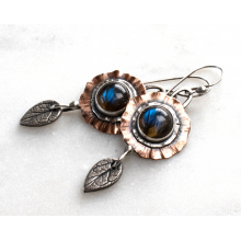 LABRADORITE FLOWER & LEAF EARRINGS IN MIXED METALS WITH 935 ARGENTIUM SILVER EAR WIRES