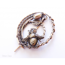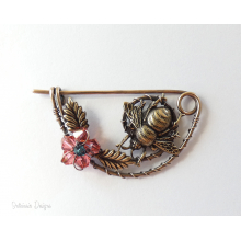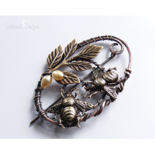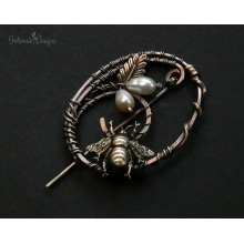 BEE SHAWL PIN/ SWEATER PIN WITH MIXED METALS AND FRESHWATER PEARL FLOWER BUDS