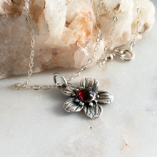 GARNET FINE SILVER FLOWER PENDANT NECKLACE