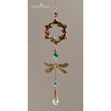 AUBERGINE, EMERALD AND MOUNTAIN BLUE DRAGONFLY SWAROVSKI CRYSTAL WINDOW SUNCATCHER WITH FLORAL FRAME