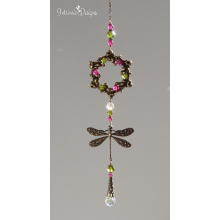 OLIVE AND MAGENTA SWAROVSKI CRYSTAL AND DRAGONFLY WINDOW SUNCATCHER WITH FLORAL FRAME