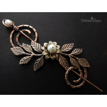 SPIRAL COPPER SHAWL PIN/ SWEATER PIN WITH A FRESHWATER PEARL AND BRASS FLOWER, BRASS LEAVES AND MIXED METALS