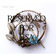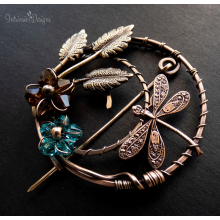 DRAGONFLY ROUND SHAWL PIN/ SWEATER PIN WITH SWAROVSKI CRYSTALS, BRASS LEAVES AND MIXED METALS