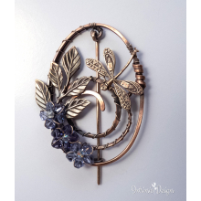 DRAGONFLY OVAL SHAWL PIN / SWEATER PIN WITH SWAROVSKI FLOWERS, BRASS LEAVES AND MIXED METALS