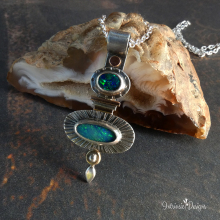 TWO OPALS ON A STERLING SILVER & MIXED METAL PENDANT NECKLACE