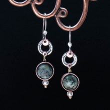 GREEN TURQUOISE DROP EARRINGS IN MIXED METALS WITH 935 ARGENTIUM SILVER EAR WIRES