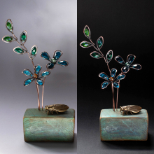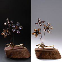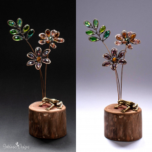 CRYSTAL FLOWERS WITH A BRASS CICADA ON A WOOD SLICE ... WINDOWSILL SUNCATCHER