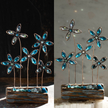 A FIELD OF BLUE CRYSTAL FLOWERS ON A LOG WITH GEMSTONES ... WINDOWSILL SUNCATCHER