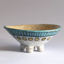 A FUN CERAMIC RING DISH WITH PAINTED DOTS AND STRIPES